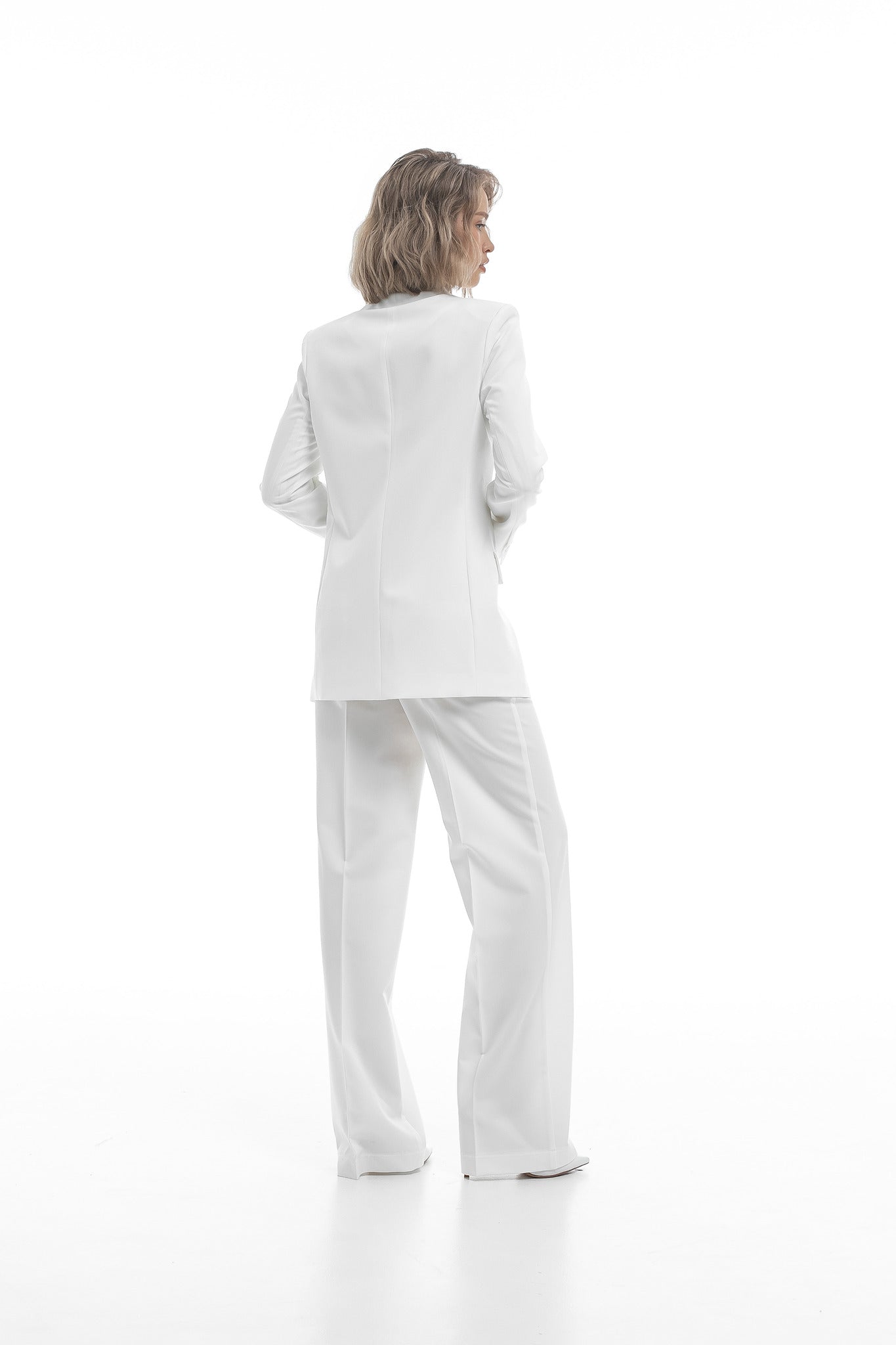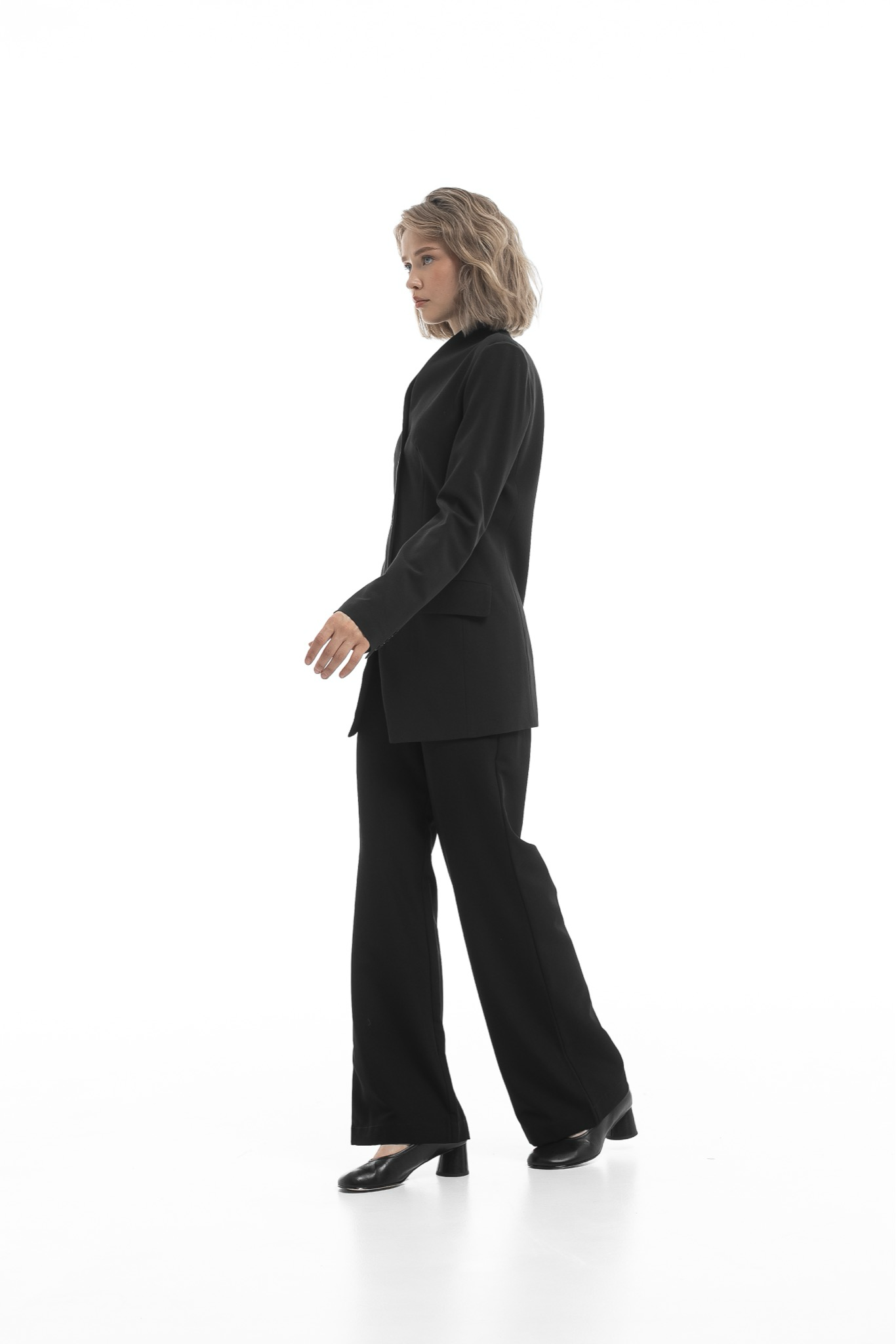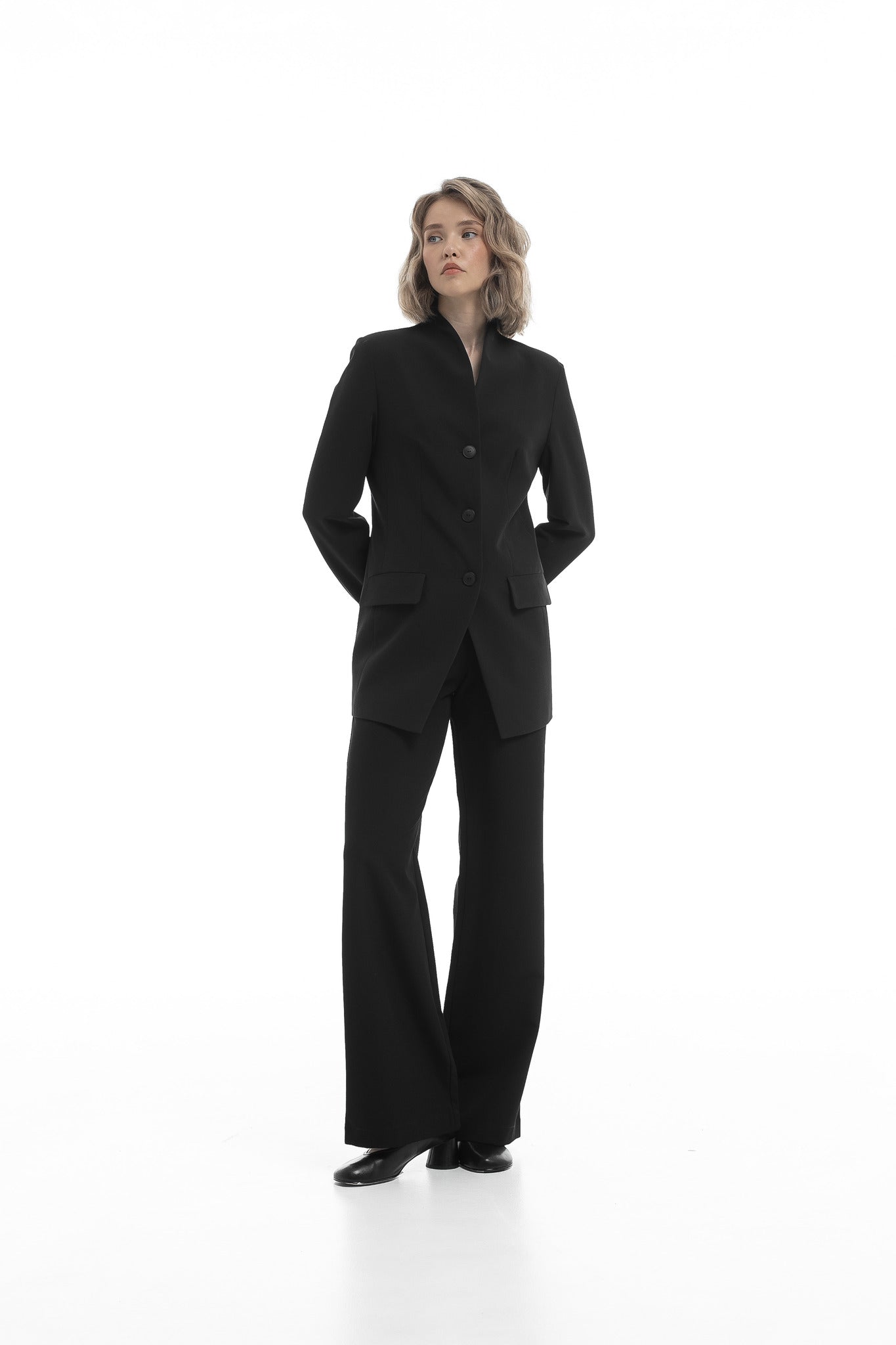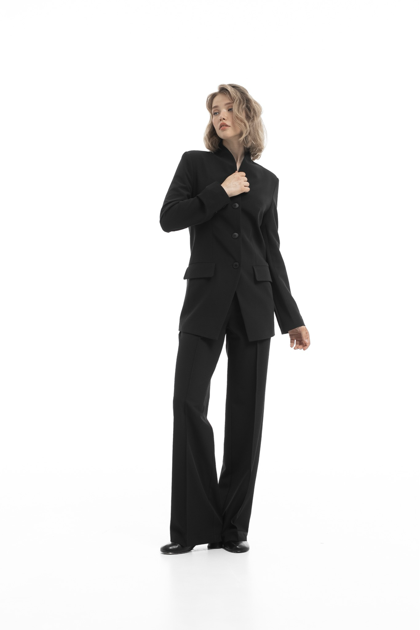 Introducing our single-breasted tailored jacket featuring a sophisticated stand collar and a distinctive curved hemline. Every detail has been carefully considered for both functionality and style: two spacious pockets for essentials, an optimal length, a convenient three-button closure, and a comfortable fit designed for professional use.